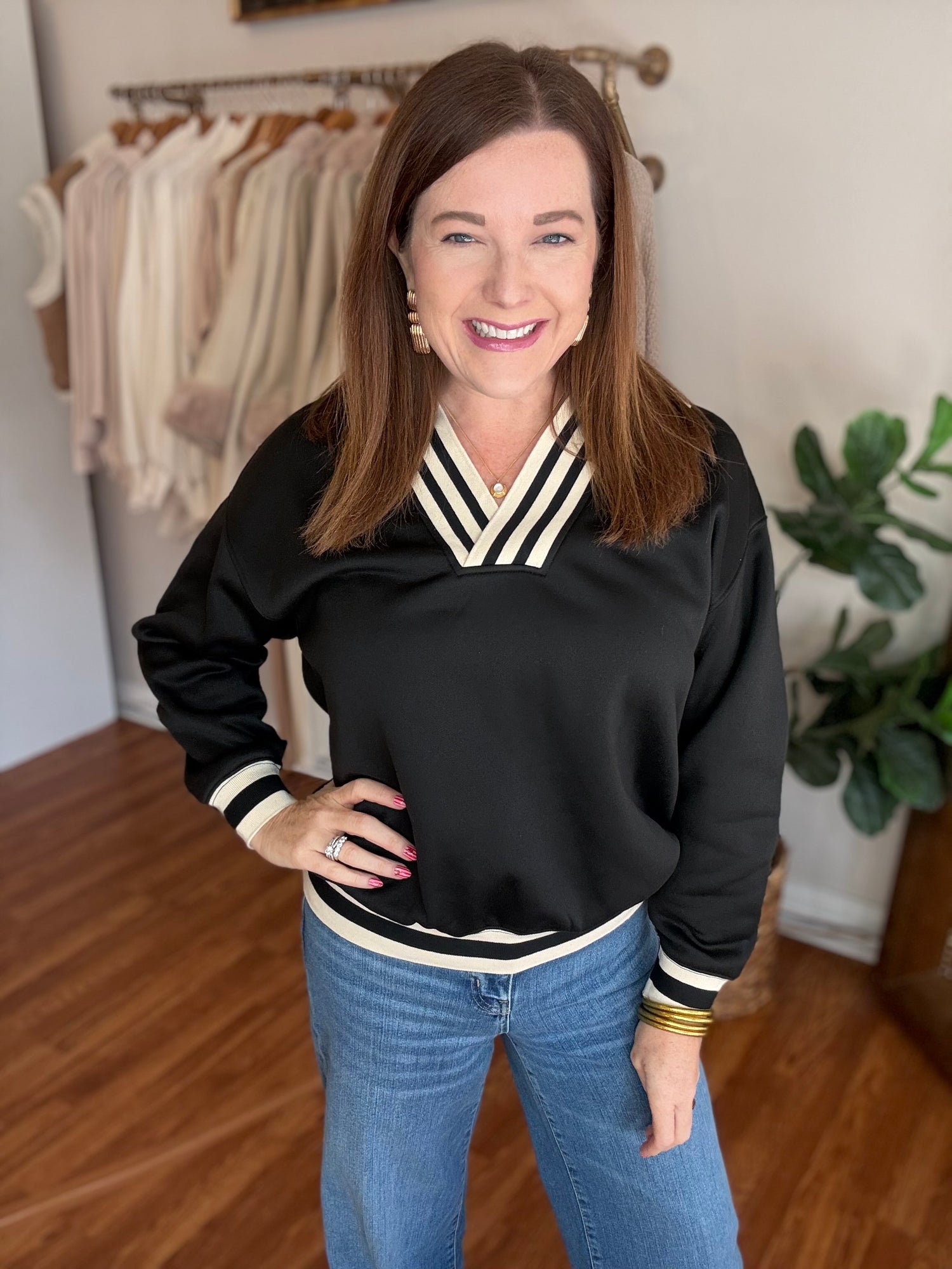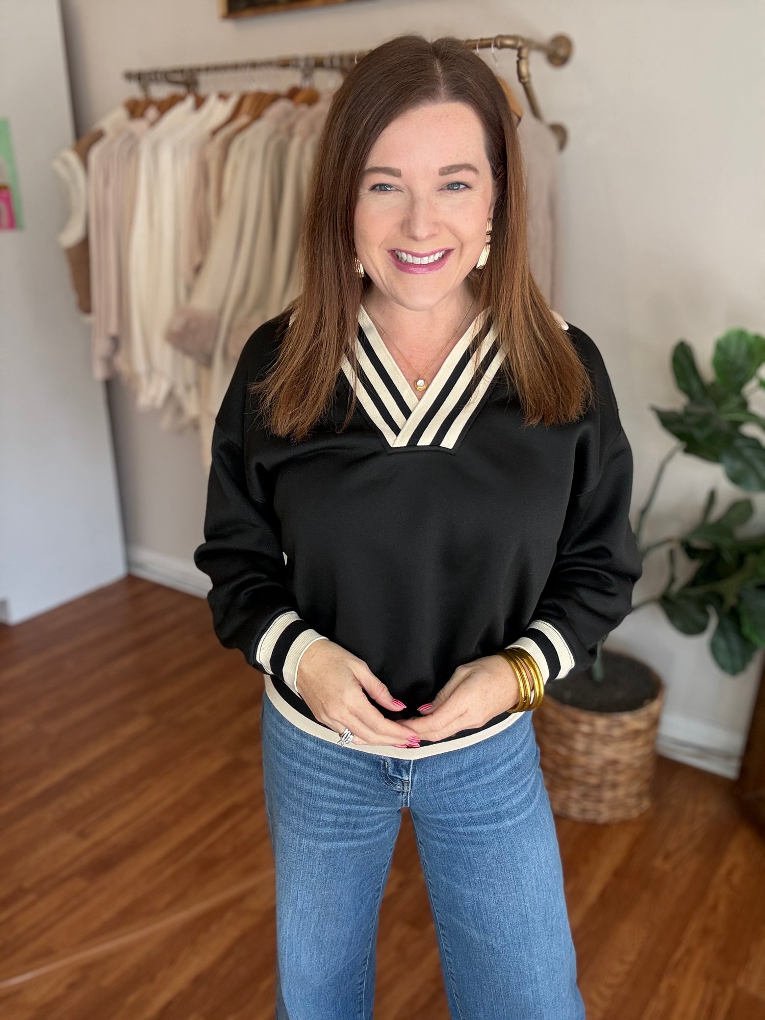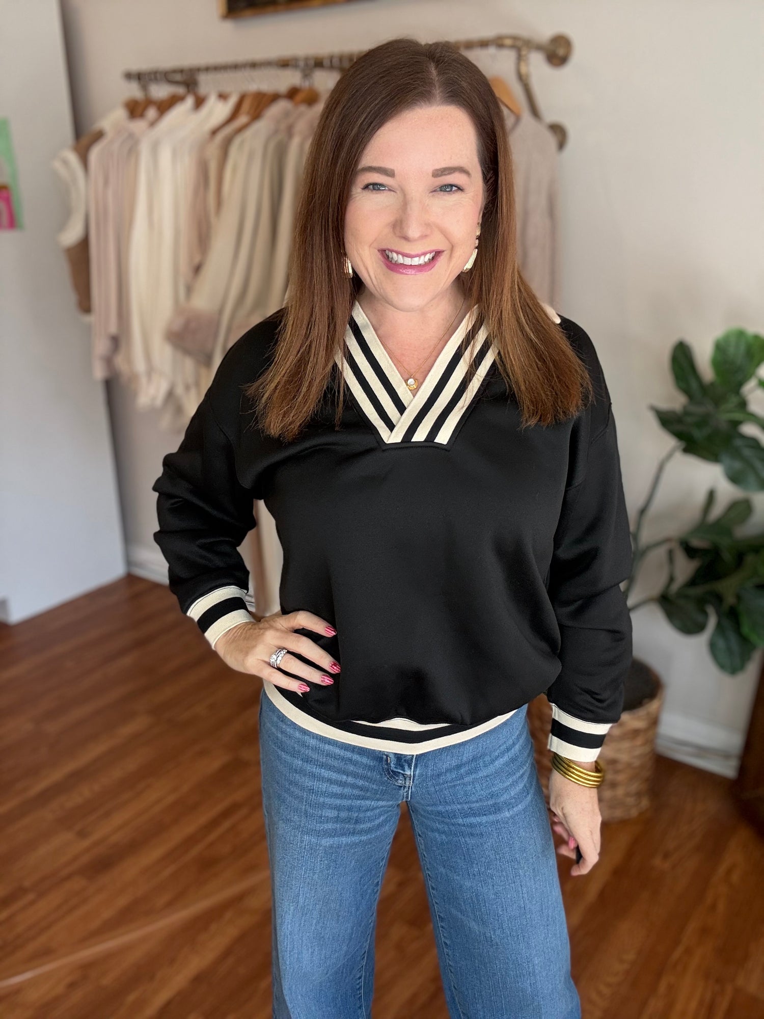 Effortlessly chic and endlessly versatile, the Easy to Love Top is your new wardrobe essential. This long sleeve v-neck pullover features a flattering silhouette that works beautifully with everything from tailored trousers to your favorite denim. The contrasting ribbed band adds a polished finishing touch that elevates the entire look. Whether you're heading to the office, meeting friends for brunch, or layering for cooler days, this top delivers comfort without compromising on style. The quality construction ensures it'll remain a go-to piece season after season. Discover why this top truly lives up to its name—it's simply easy to love. These are a soft, stretchy knit and run true to size. Candace is 5'4", size 6/8, bra 38c, and wearing a small.