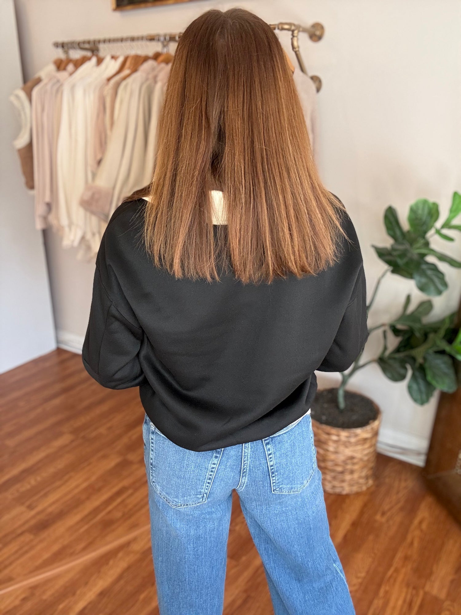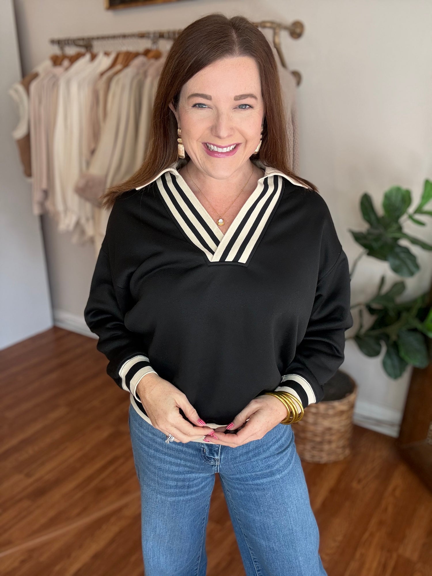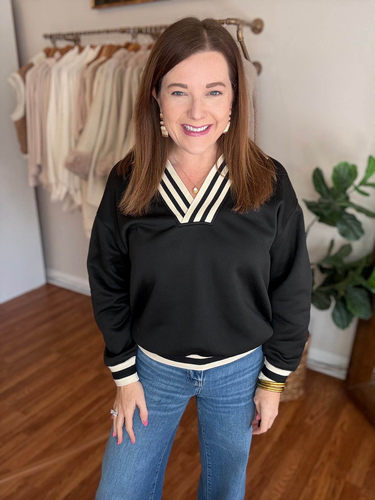 Effortlessly chic and endlessly versatile, the Easy to Love Top is your new wardrobe essential. This long sleeve v-neck pullover features a flattering silhouette that works beautifully with everything from tailored trousers to your favorite denim. The contrasting ribbed band adds a polished finishing touch that elevates the entire look. Whether you're heading to the office, meeting friends for brunch, or layering for cooler days, this top delivers comfort without compromising on style. The quality construction ensures it'll remain a go-to piece season after season. Discover why this top truly lives up to its name—it's simply easy to love. These are a soft, stretchy knit and run true to size. Candace is 5'4", size 6/8, bra 38c, and wearing a small.