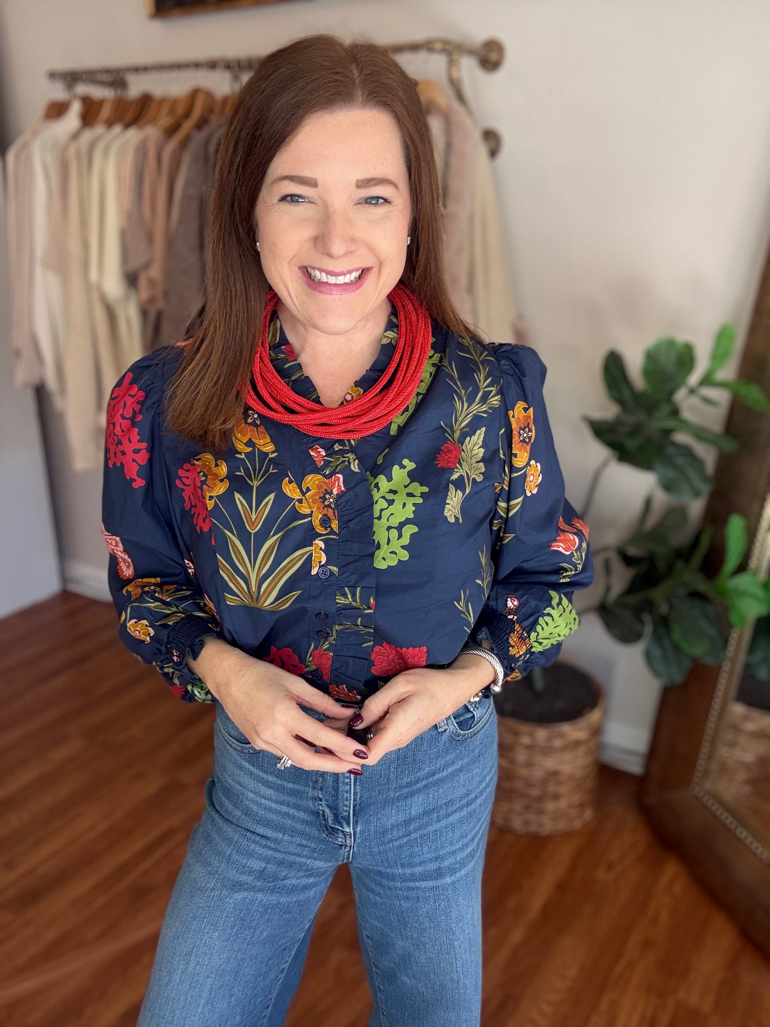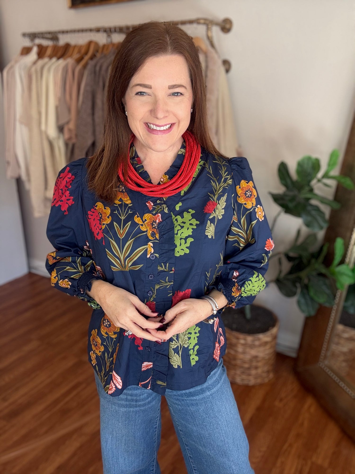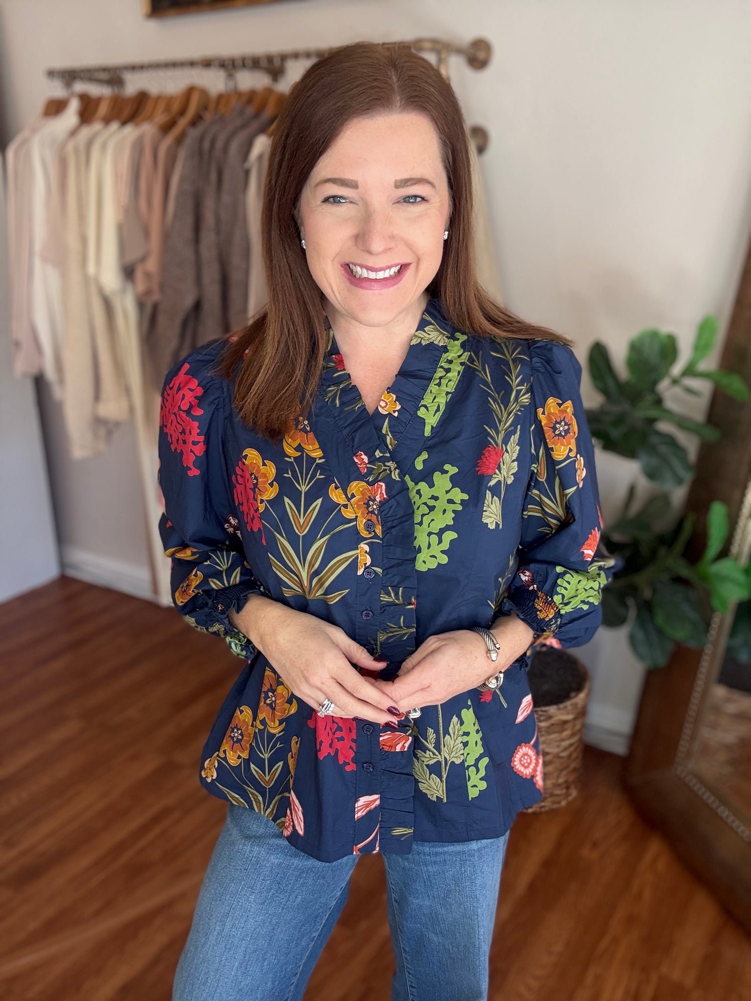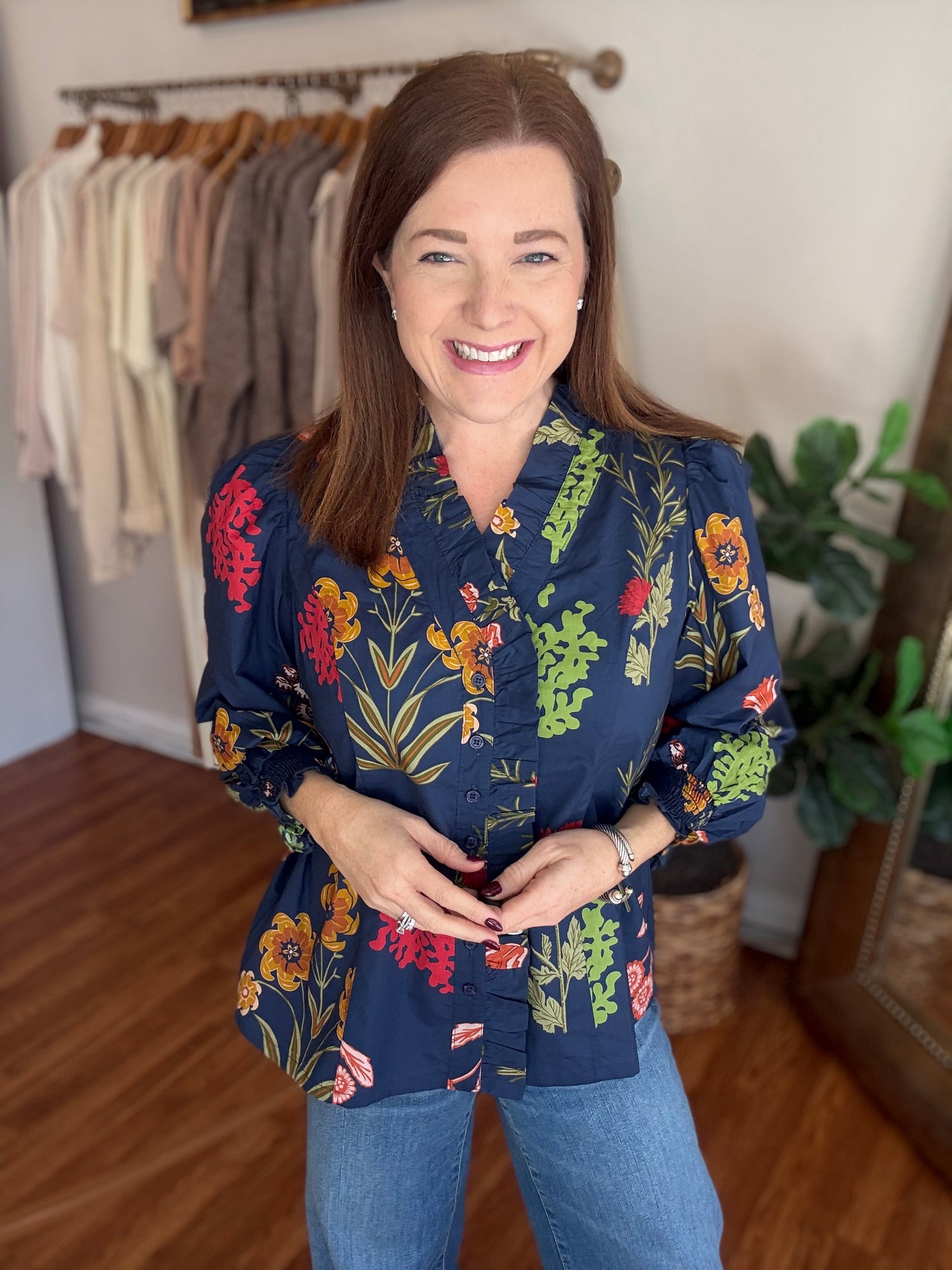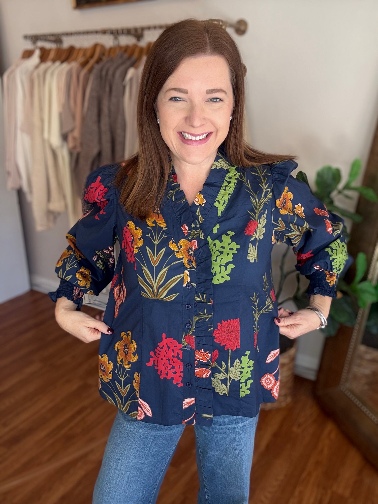 Elevate your wardrobe with this stunning Follow Along Top, the perfect blend of timeless style and contemporary flair. Featuring a classic navy base adorned with vibrant pops of red and green, this piece brings fresh, on-trend floral energy to any outfit. The charming button-up front paired with delicate ruffle detailing creates an effortlessly chic silhouette that flatters and inspires confidence. Whether you're dressing up for a special occasion or adding polish to your everyday look, this versatile top delivers the fashion-forward appeal you've been searching for. These have a slight amount of stretch and run true to size. Candace is 5'4", size 6/8, bra 38c, and wearing wearing a small.