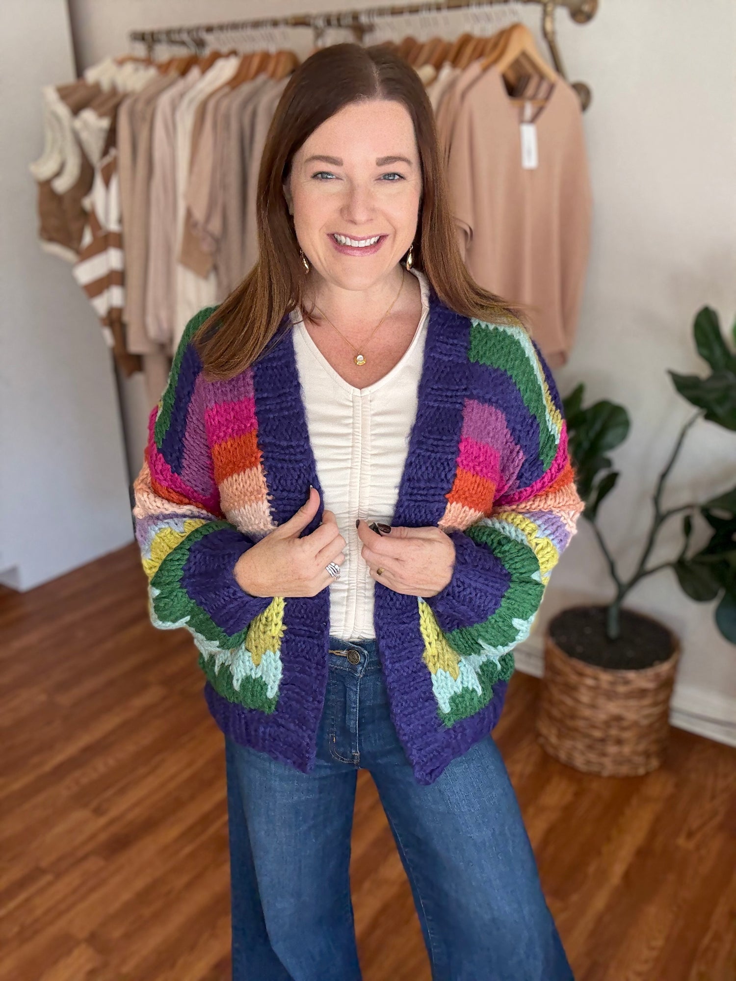 Upgrade your wardrobe with our It's Your Time Sweater! This fun, vibrant, and colorful chunky knit cardigan is the perfect addition to any outfit. Keep yourself warm and stylish while making a statement with this must-have piece. Perfect for any occasion. Don't miss out, get yours today! These run true to size to slightly oversized. Candace is 5’4”, size 6/8, bra 38c, and wearing a small.
