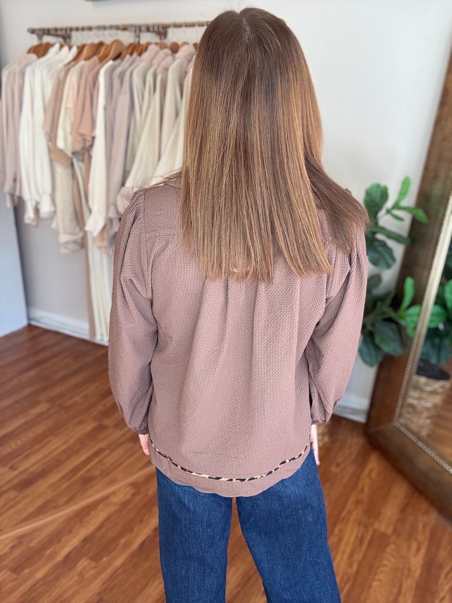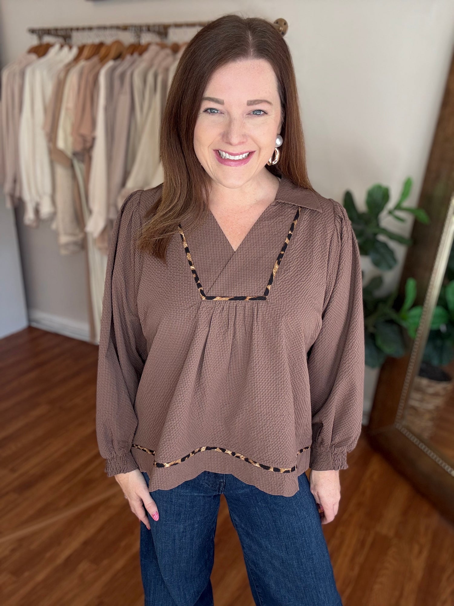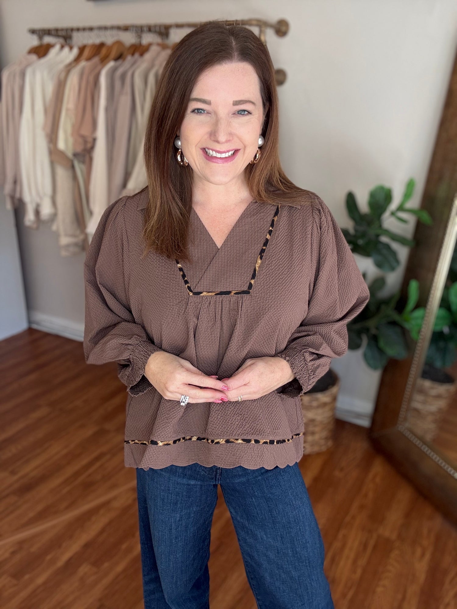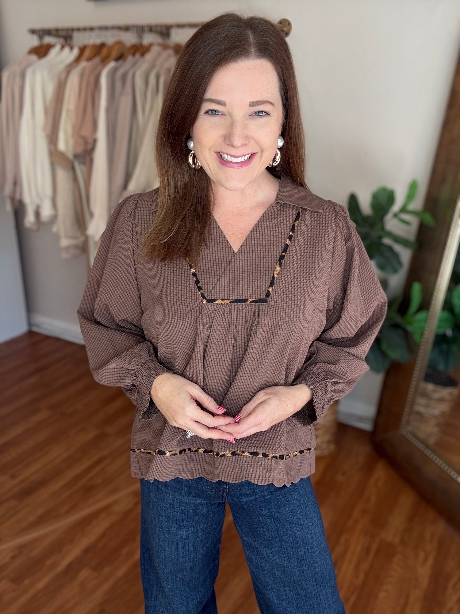 Introducing the Keep it Chic Top - the perfect blend of trendy and chic. This top features a stylish brown color with leopard trim detail, giving you a bold and fashionable look. The textured fabric adds a unique touch, while the loose fit and scalloped detail provide both comfort and style. Elevate your wardrobe with this must-have piece! These run true to size to slightly oversized. Candace is 5’4”, size 6/8, bra 38c, and wearing a small.