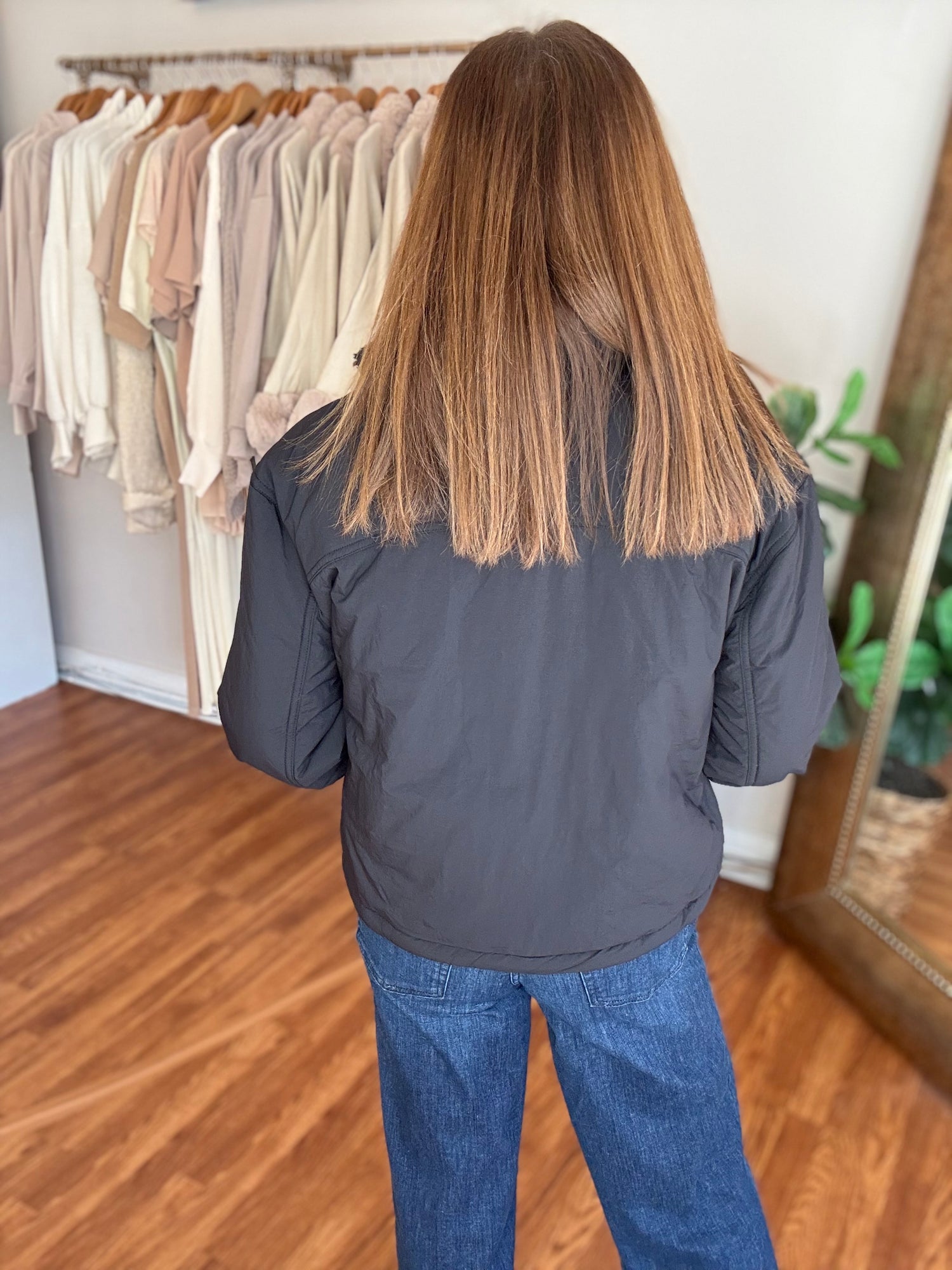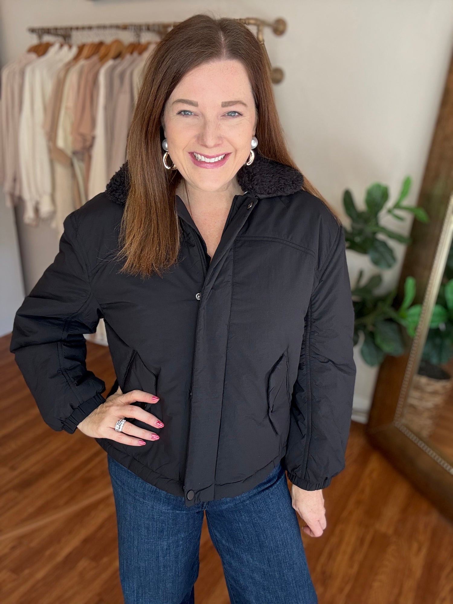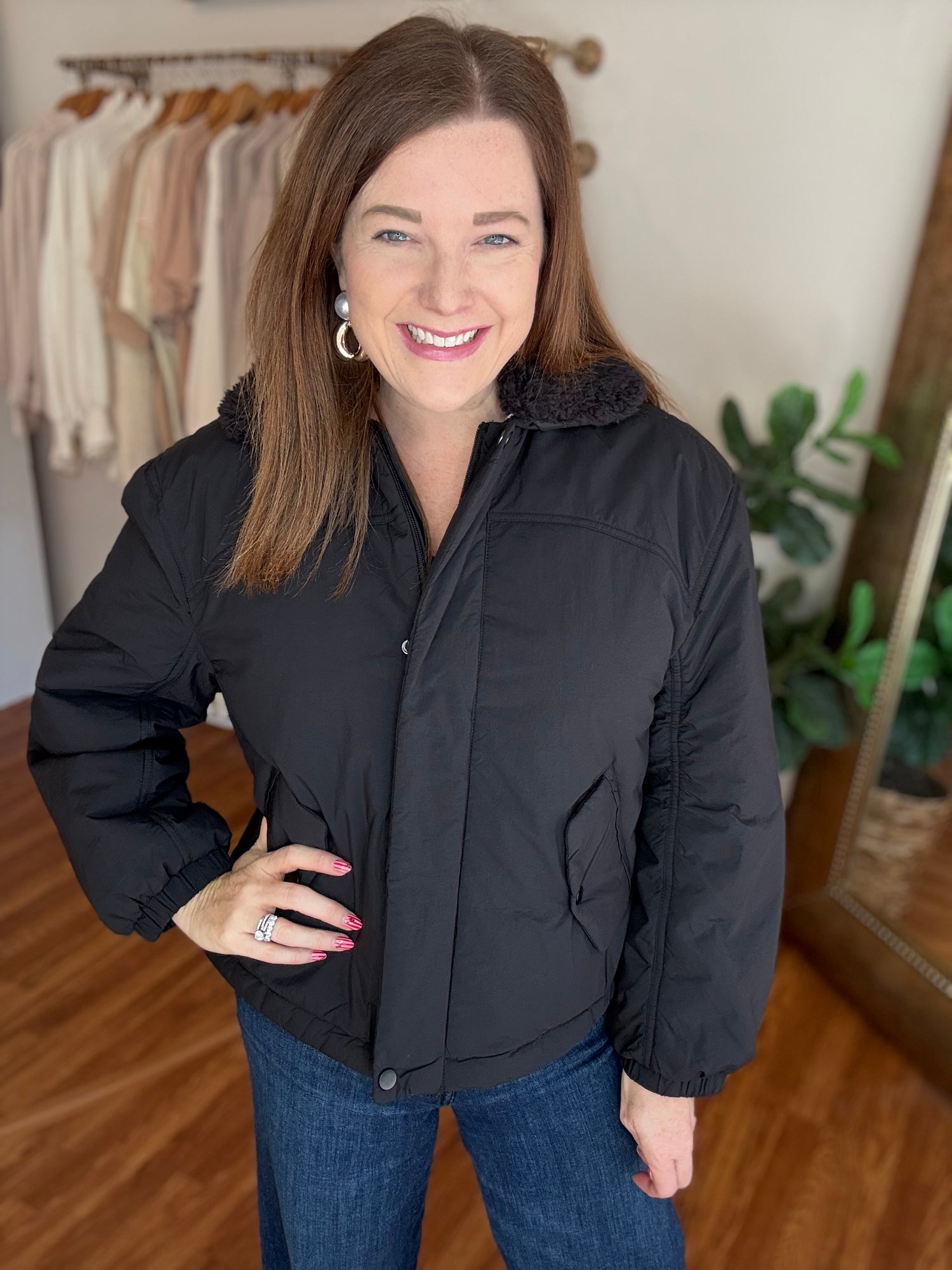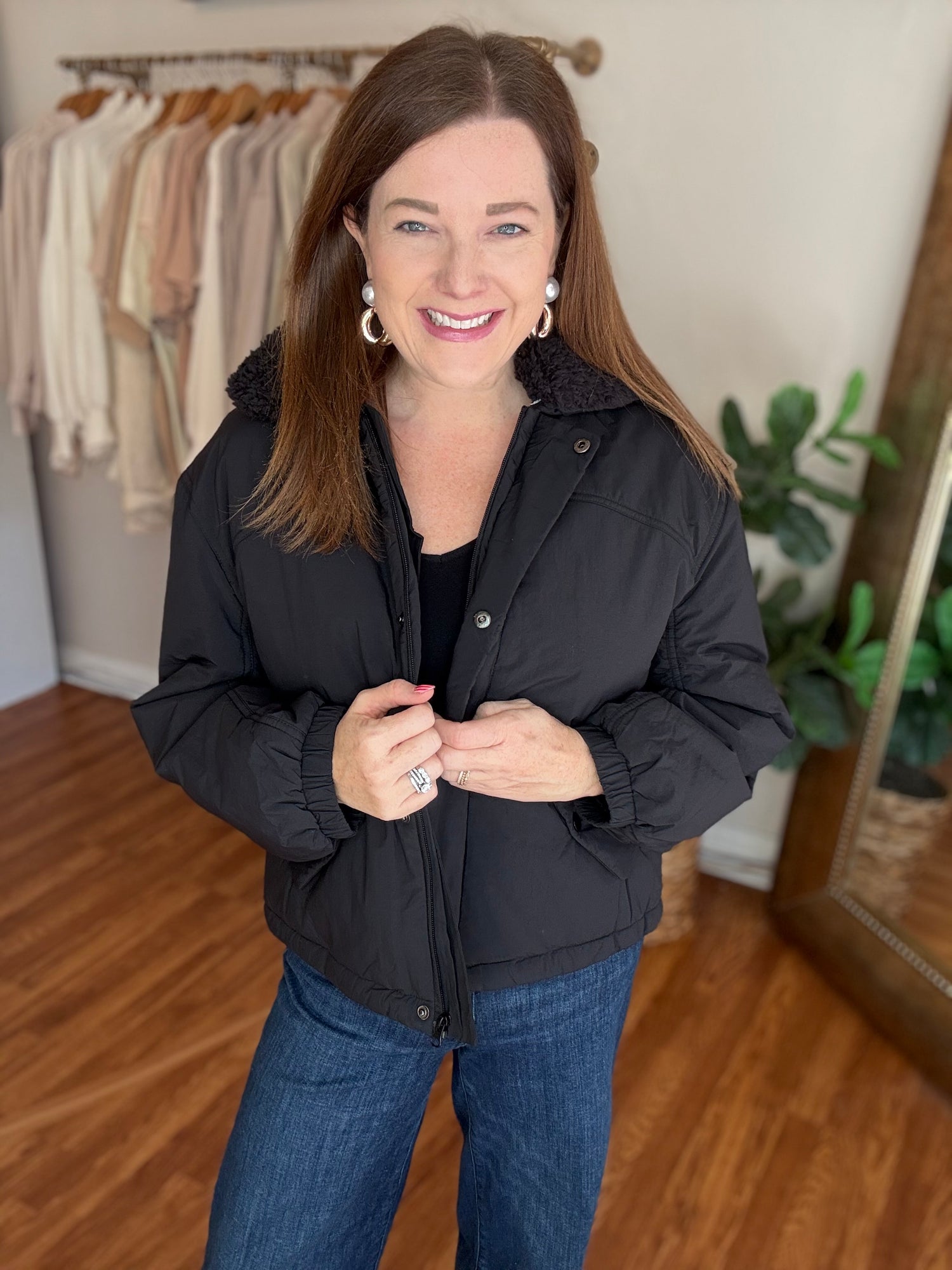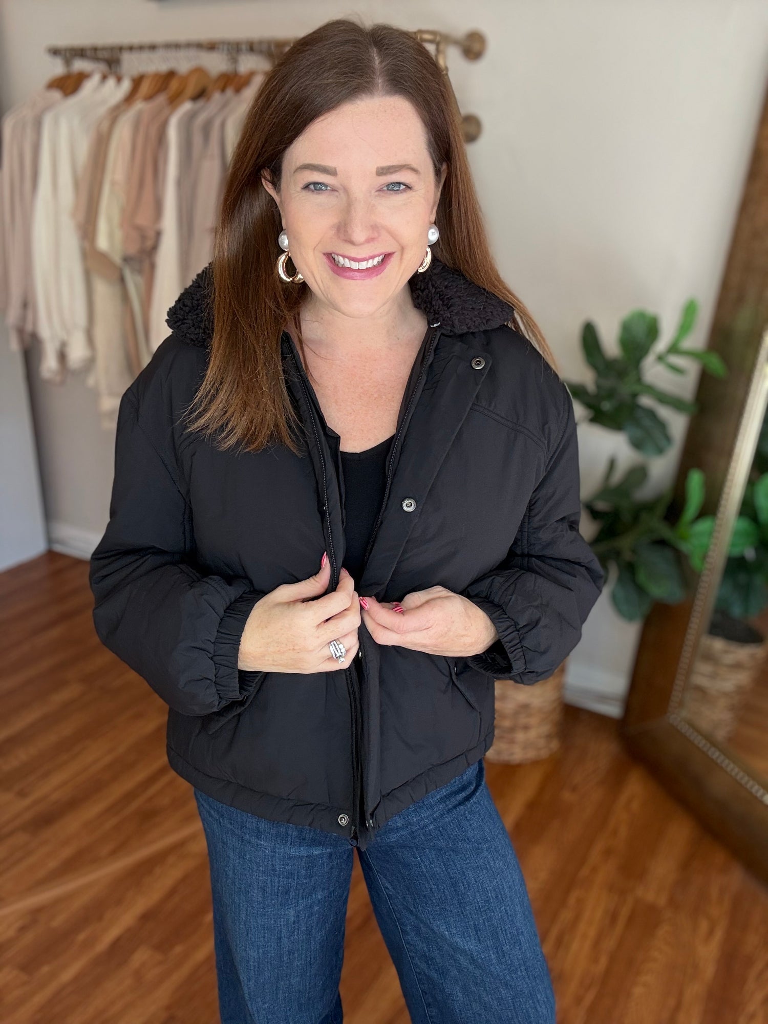 Stay warm and stylish with the Making Moves Jacket, your go-to layer for effortless cool. This classic black puffer delivers serious insulation without the bulk, while the cozy sherpa-lined collar adds a touch of luxury against your skin. Perfect for transitional weather or layering under your favorite coat, it's the versatile piece that works as hard as you do. Move through your day with confidence and comfort. These have no stretch and run true to size. Candace is 5'4", size 6/8, bra 38c, and wearing a small.