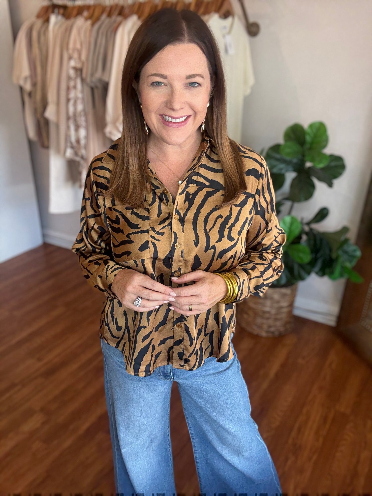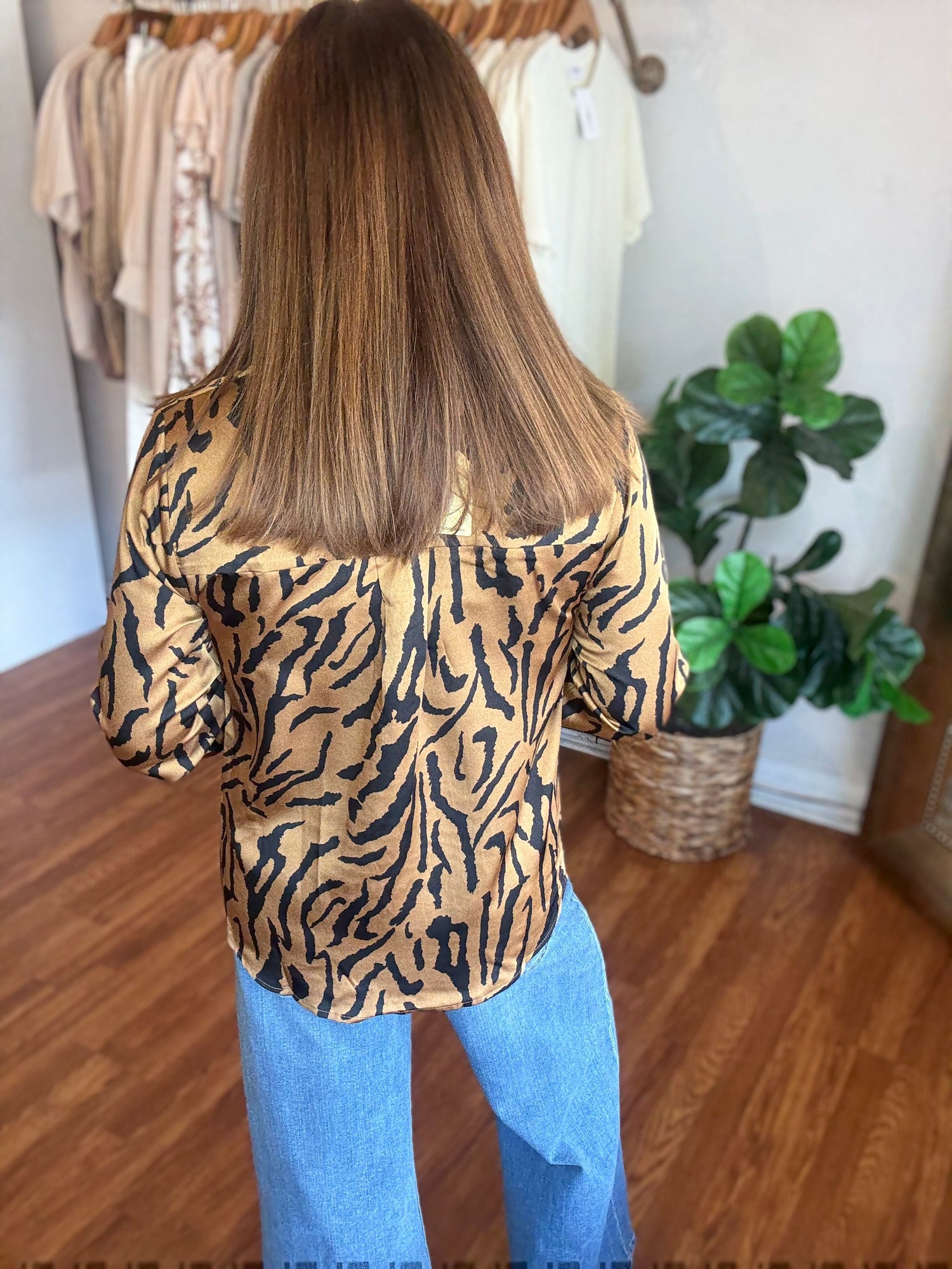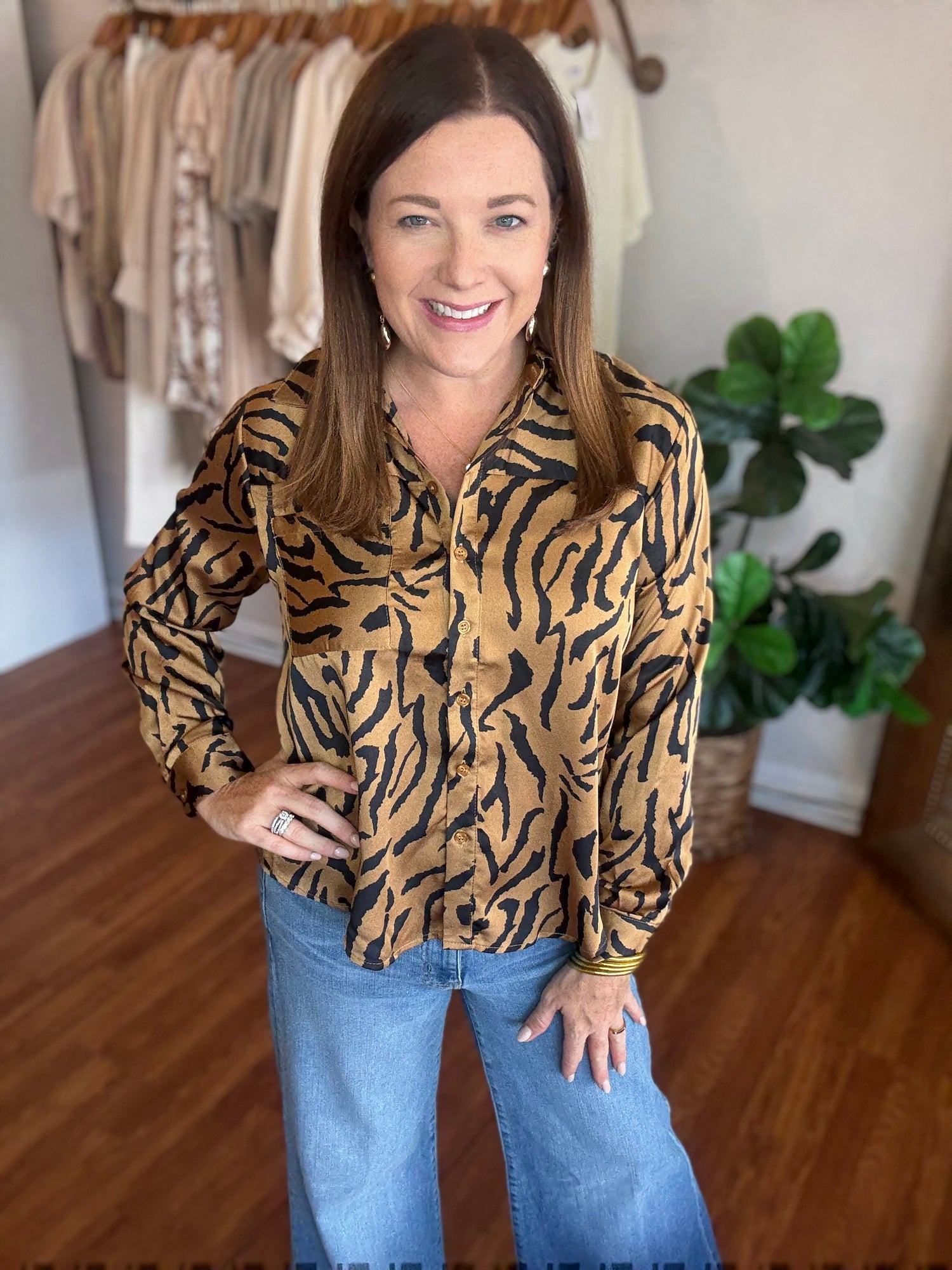 Make a bold statement with the Somewhere Out There Top, featuring a striking zebra print that adds wild sophistication to your wardrobe. Designed with a classic collared neck, a convenient front pocket, and a buttoned closure for easy wear. The back box pleat enhances movement and comfort, while long sleeves with buttoned cuffs offer a polished finish. Perfect for elevating your everyday style with a touch of fierce elegance. These have no stretch and run true to size. Candace is 5'4", size 6/8, bra 38c, and wearing a small.