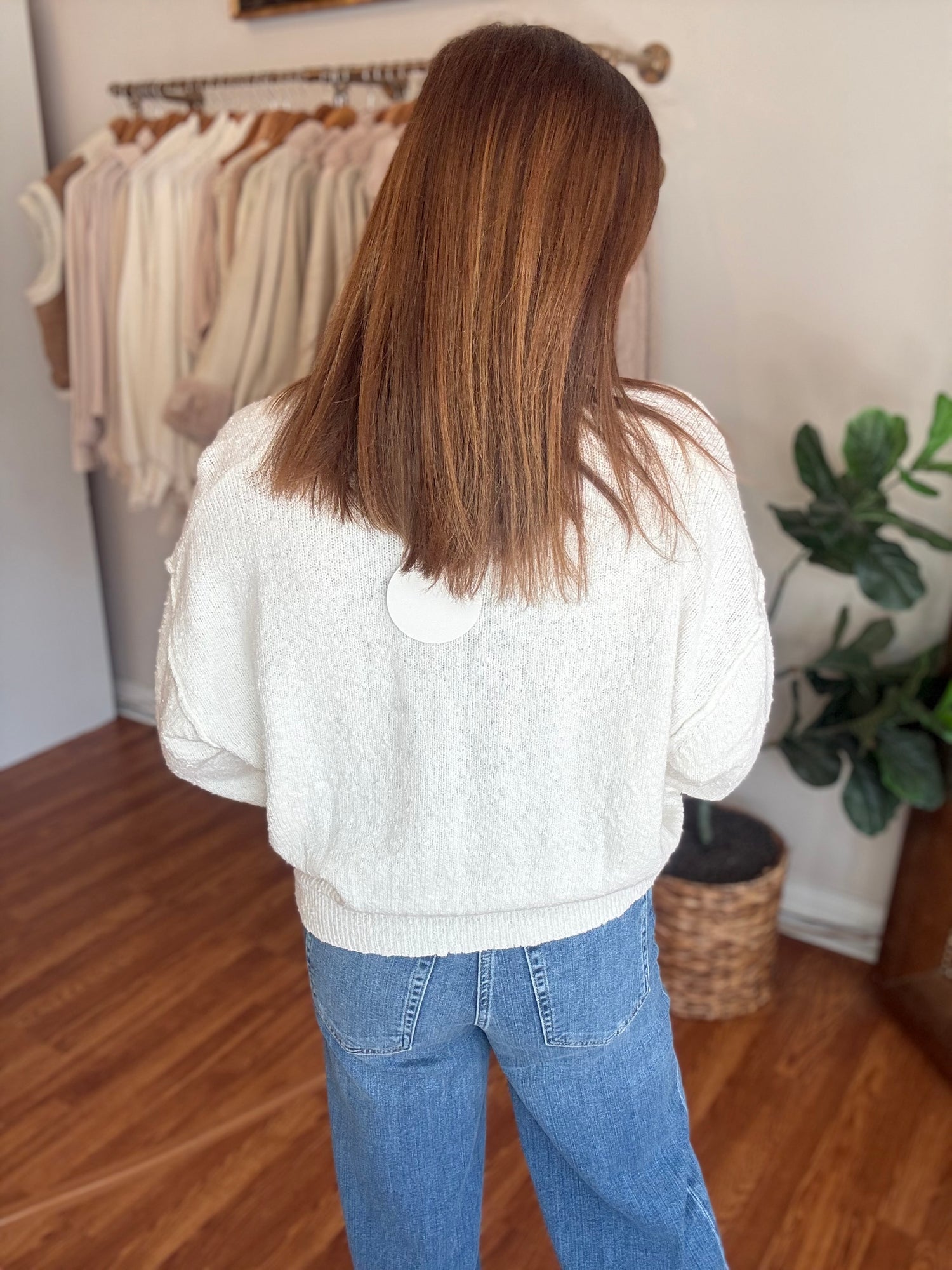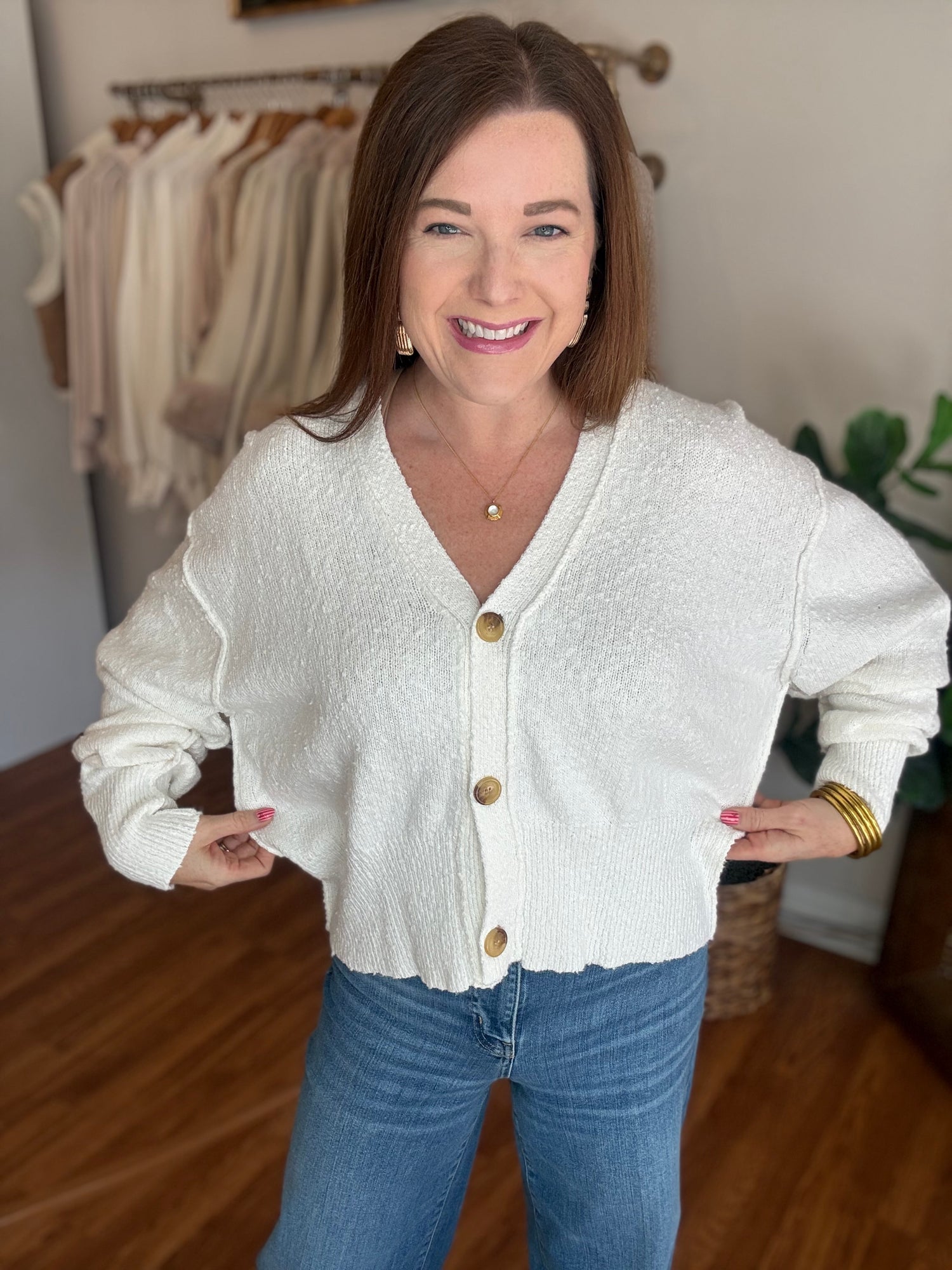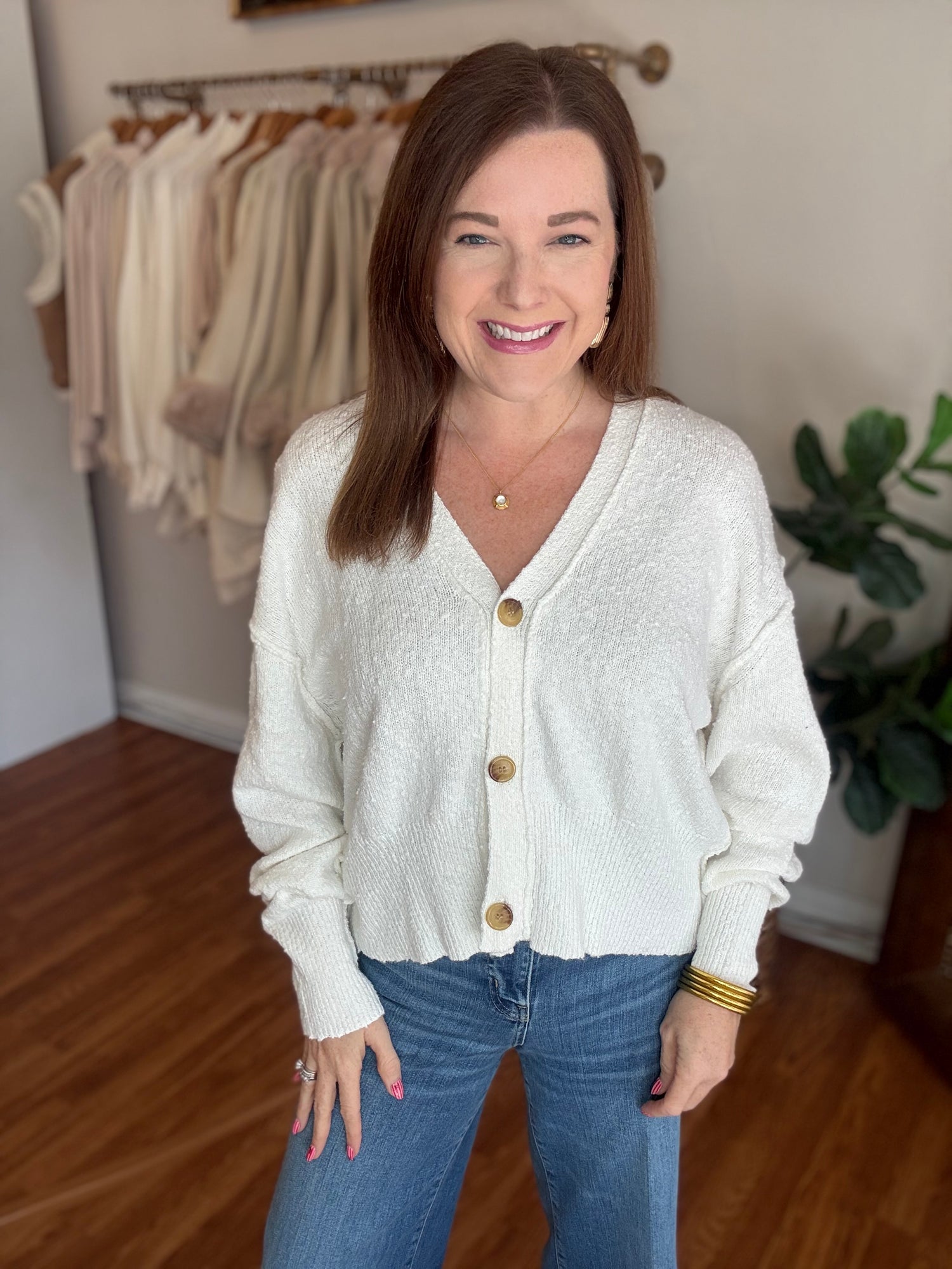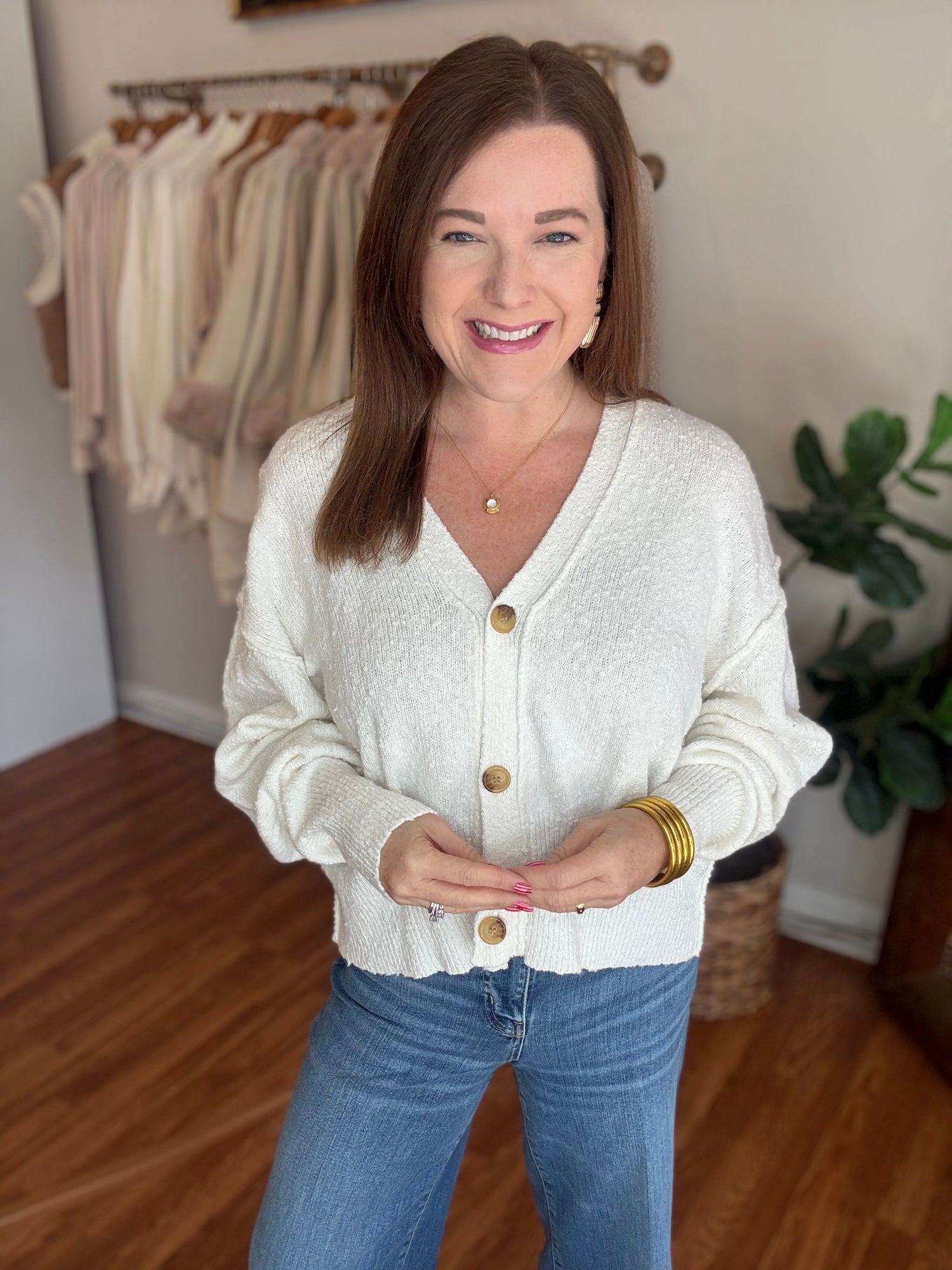 Effortlessly elevate your everyday style with the Take Your Turn Cardigan in Cream. This button-up piece features a relaxed, oversized silhouette that drapes beautifully while the slightly cropped length keeps proportions modern and flattering. Perfect for layering over dresses, tees, or tanks, it's the versatile staple that works from casual coffee runs to weekend brunches. Throw it on and instantly transform any outfit into something polished and put-together. These run slightly generous in size. Candace is 5'4", size 6/8, bra 38c, and wearing a small.