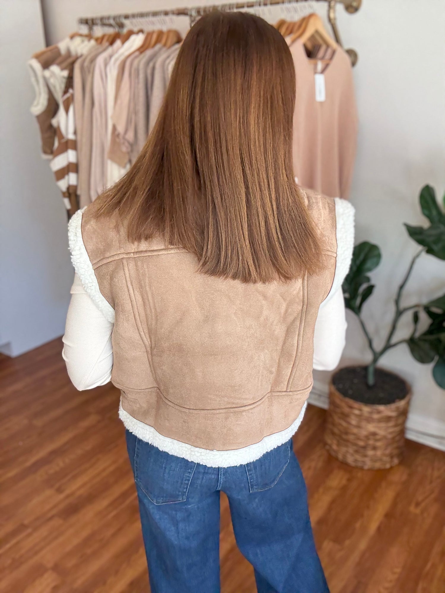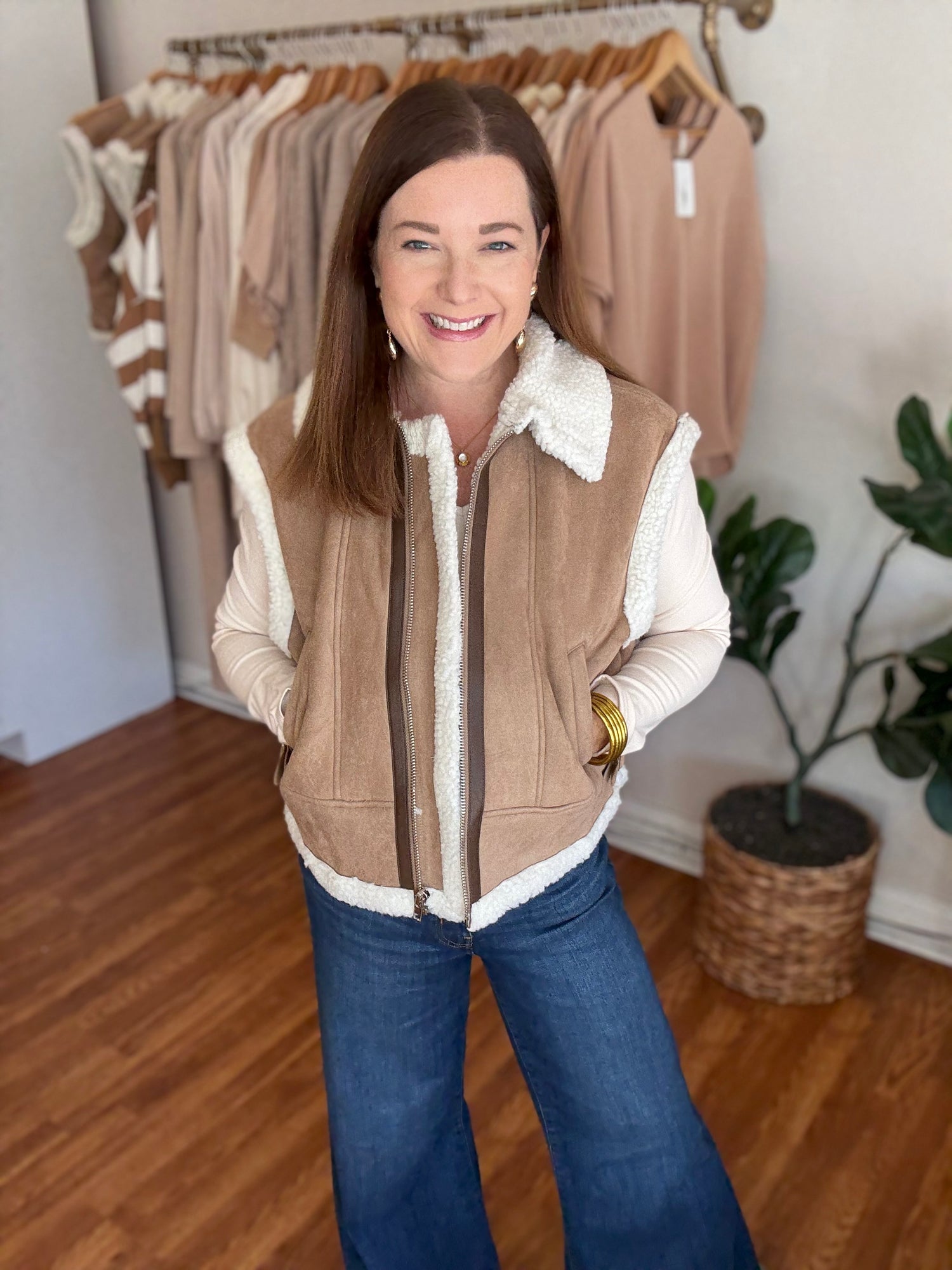 Experience luxurious comfort and style with the This is It Vest! Made with faux suede and a sleek shearling detail, this vest is accented with contrasting dark brown trim for a sophisticated touch. Stay warm and cozy while looking effortlessly chic. Fall in love with the perfect blend of fashion and function. These have no stretch and run true to size. Candace is 5’4”, size 6/8, bra 38c, and wearing a small.