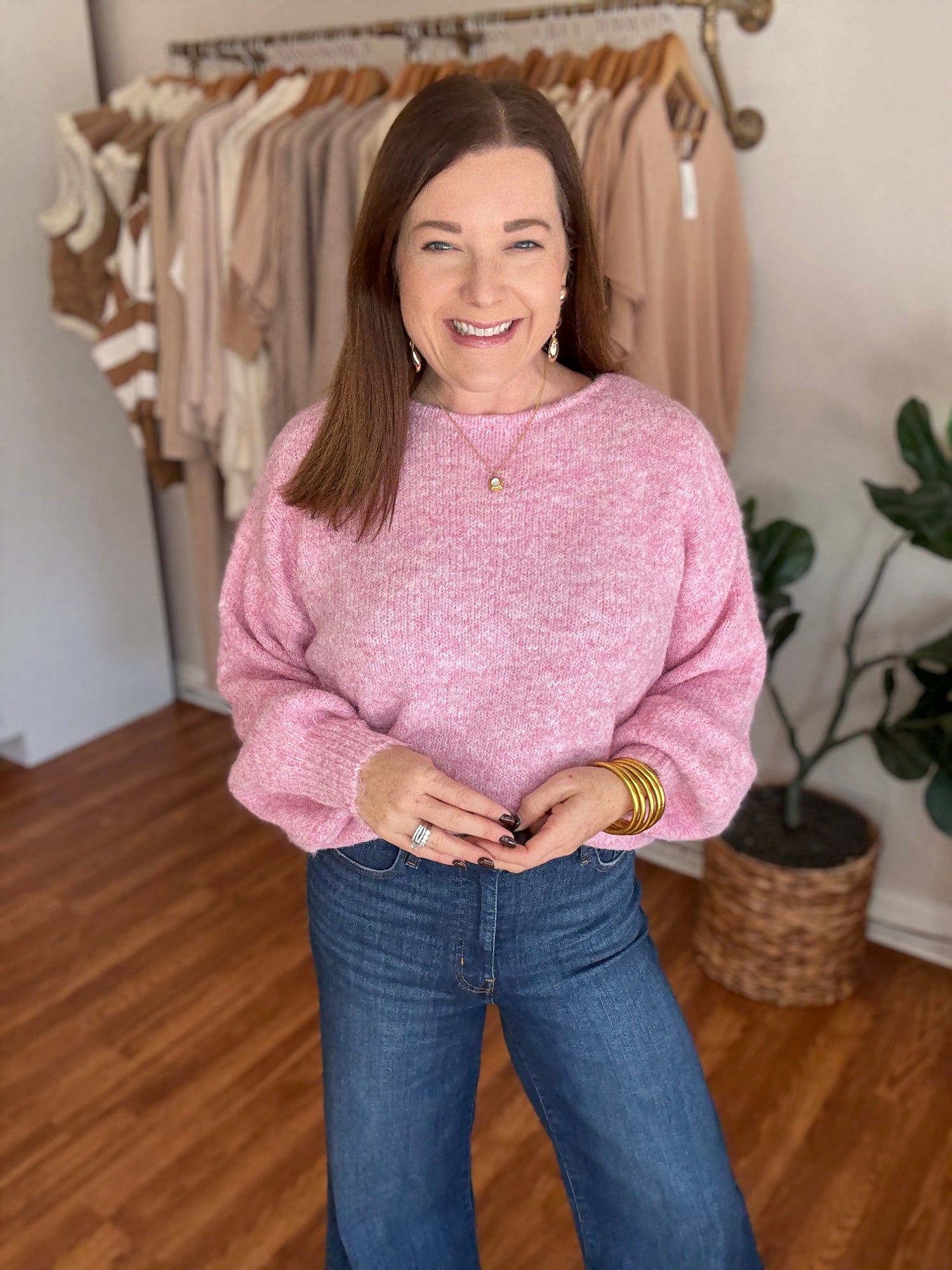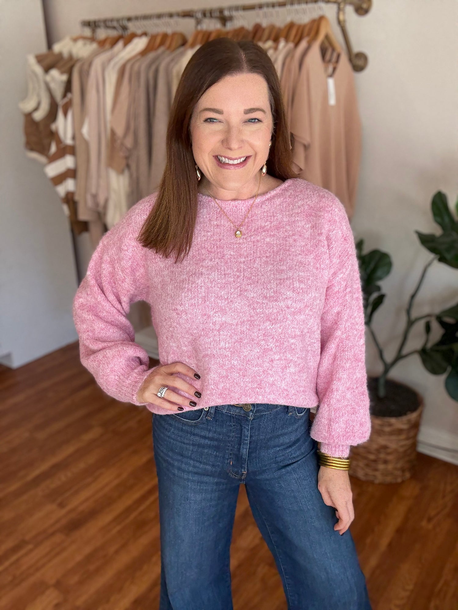 Indulge in timeless comfort with our Time Goes By Sweater! This classic, cozy sweater in a beautiful pink heather color is perfect for any occasion. Keep warm and stylish all year round with this must-have addition to your wardrobe. These run true to size. Candace is 5’4”, size 6/8, bra 38c, and wearing a small.