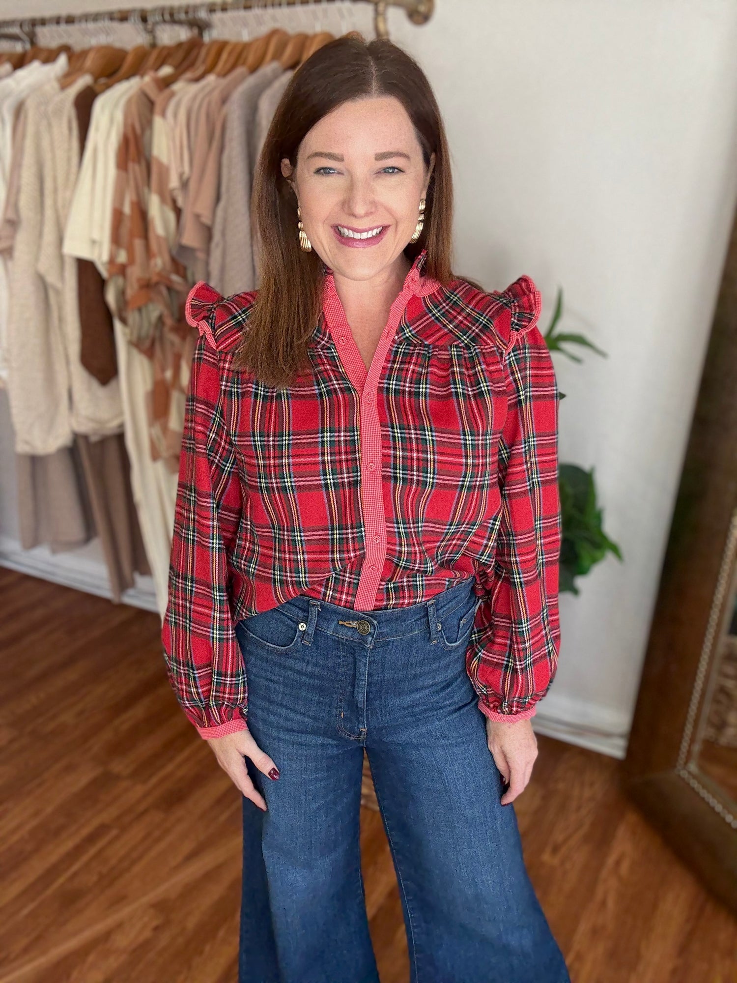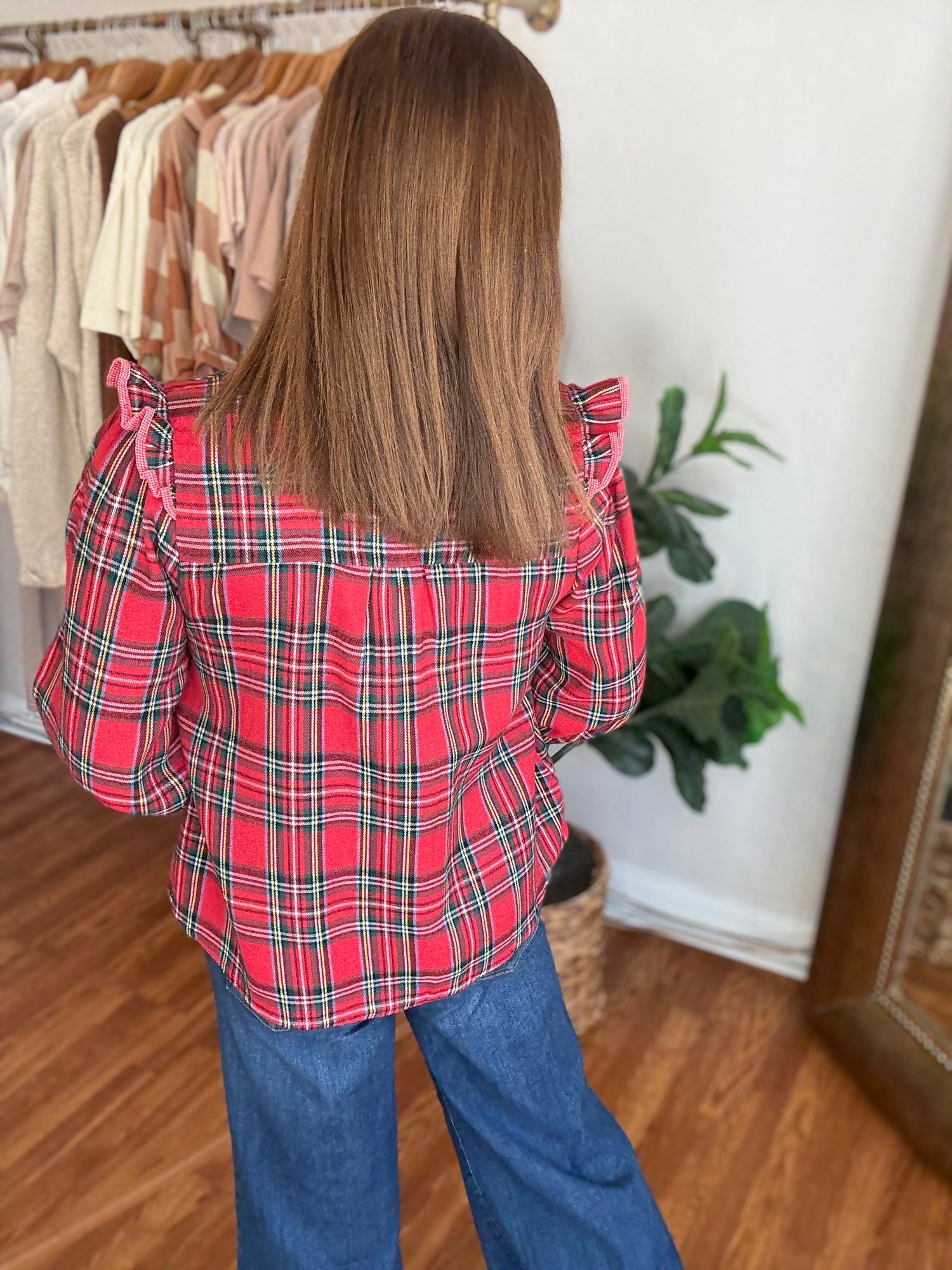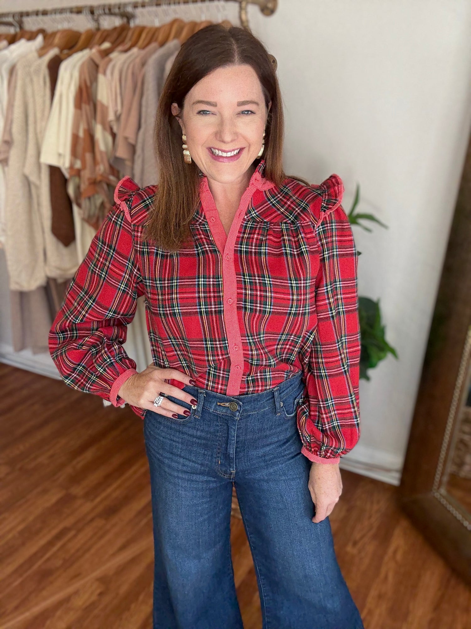 Get ready for the holiday season with our 'Tis the Season Top! Featuring a classic tartan plaid design with contrasting trim, this top is perfect for any festive occasion. The button up style and ruffle detail on the shoulders add a touch of elegance, while the soft, flannel like material keeps you warm and cozy. These have no stretch and run true to size. Candace is 5’4”, size 6/8, bra 38c, and wearing a small.