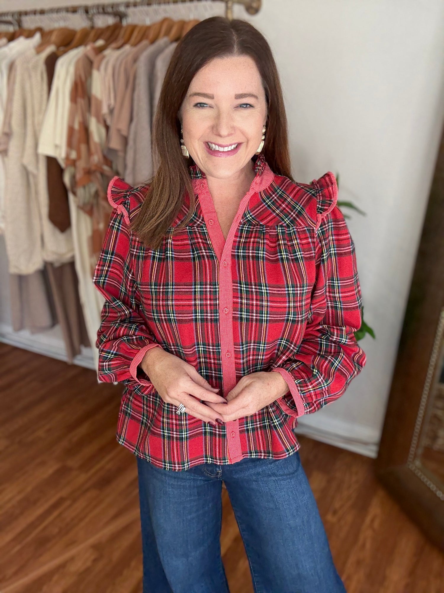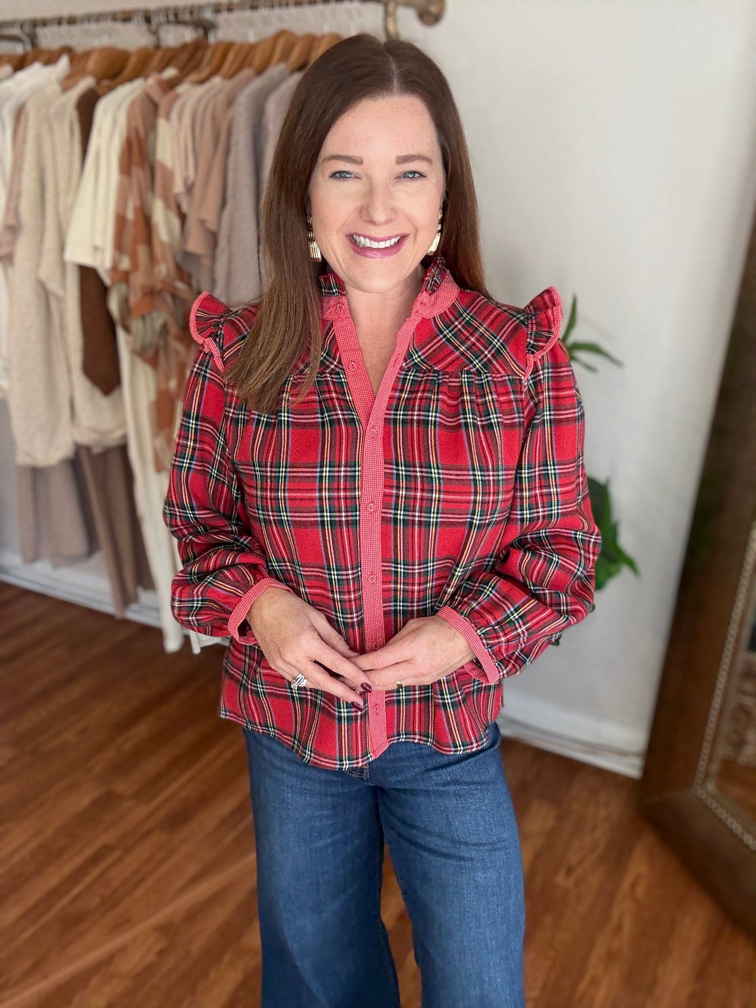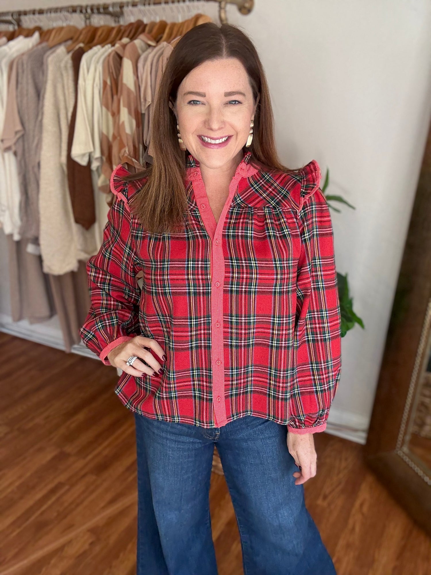 Get ready for the holiday season with our 'Tis the Season Top! Featuring a classic tartan plaid design with contrasting trim, this top is perfect for any festive occasion. The button up style and ruffle detail on the shoulders add a touch of elegance, while the soft, flannel like material keeps you warm and cozy. These have no stretch and run true to size. Candace is 5’4”, size 6/8, bra 38c, and wearing a small.